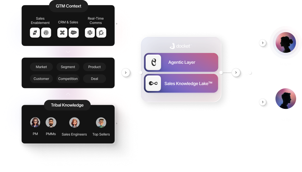 Docket Sales Knowledge Lake connects to your docs and systems to continuously learn from buyer questions and team insights, then delivers the right knowledge in conversations when it matters most, while keeping your data secure and never training shared models.