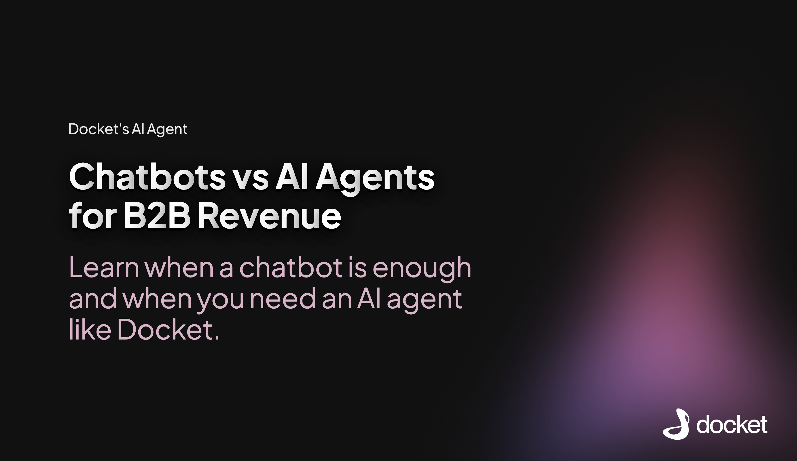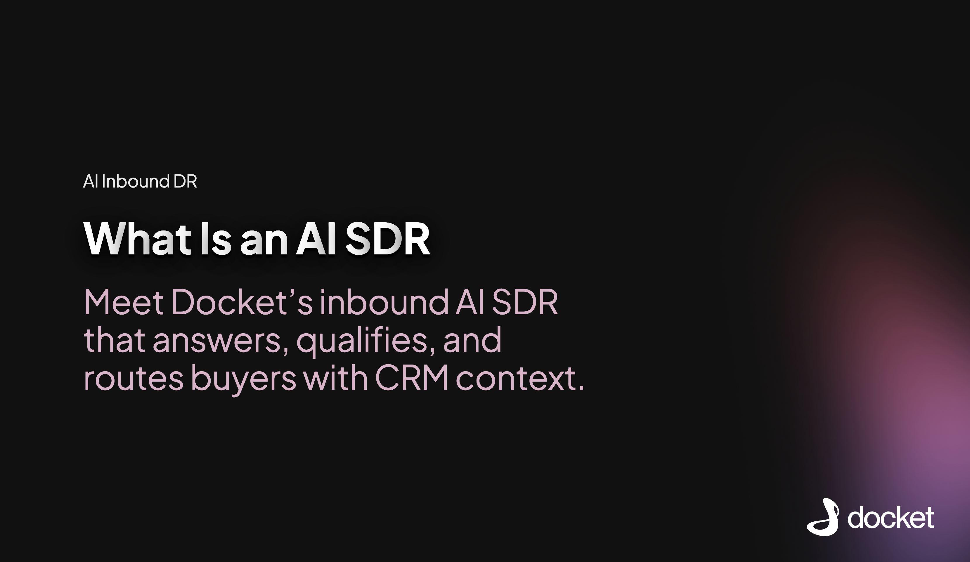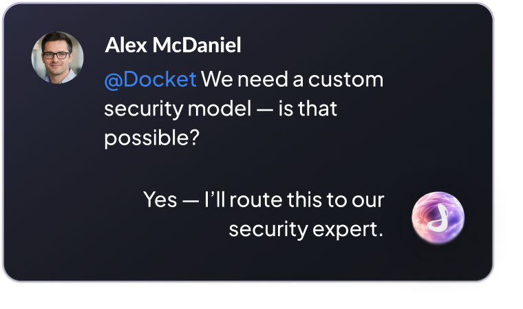 Docket’s product-expert AI agents act as always-on members of your inbound team. Docket AI Marketing Agent converts inbound traffic into qualified pipeline, and Docket AI Sales Agent that helps reps handle technical evaluation and close faster. Every interaction is synced to your CRM and routed to the right rep with full context.
