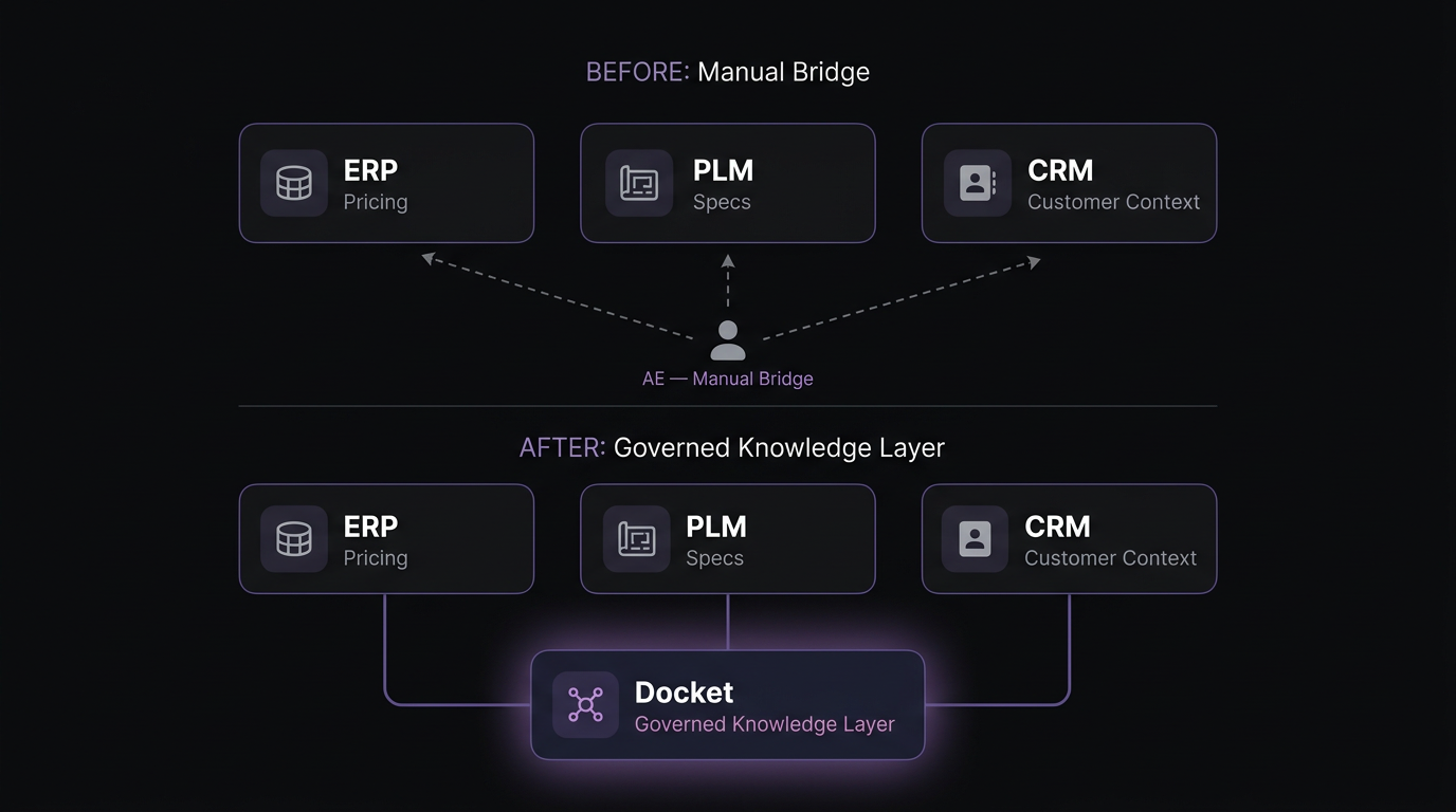 One manufacturer Docket works with (complex product line, hundreds of active SKUs, application engineers fielding 20+ RFQs a week) was running an 8-day average quote cycle. After connecting product data, engineering specs, and pricing logic into a single governed workflow, their quote turnaround dropped to under an hour. Spec retrieval, pricing context, and product configuration became accessible to reps and AEs in real time — without cross-system lookups or senior engineering availability as prerequisites.